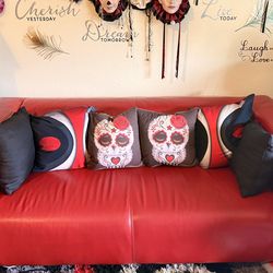 Small Modern Red Leather Sofa with 6 Decorative Pillows$150Ventura, CA