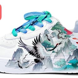 Pls choose A or B:Custom Hand-Painted Sneakers Featuring an Asian Mountain Landscape Design. White Sneakers with Turquoise Laces, Adorned with Hand-Pa$29Simi Valley, CA