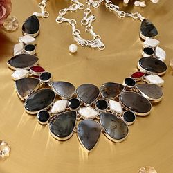 Montana Agate, Biwa Pearl, Onyx And Garnet 925 Sterling Silver Overlay Big Cluster Necklace$75Camarillo, CA
