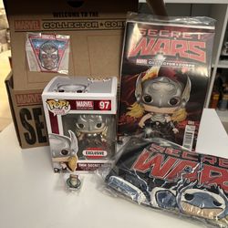 Funko Pop Thor (Secret Wars) # 97, Secret Wars 001 variant comic book, pin & patch and t-shirt $25Simi Valley, CA