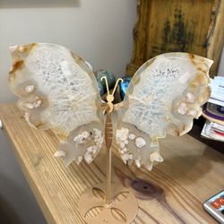 flower agate,pink amethyst with golden healer butterfly wings on a metal stand$200Saraland, AL