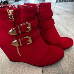 Red Faux Suede Forever High Top 3" Wedge Heel Zip Up Gold Ankle Booties Boots Size 8$10Corona, CA