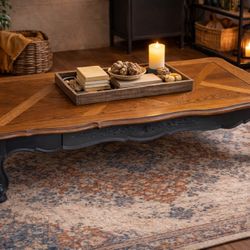 Beautiful solid wood coffee table with a stunning parquet-style top and elegant curved legs. Recently refinished and sealed, ready for everyday use. T$375Peoria, IL