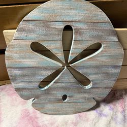 This wooden sand dollar wall art features a distressed, weathered finish in blue and brown tones,$15South Bend, IN
