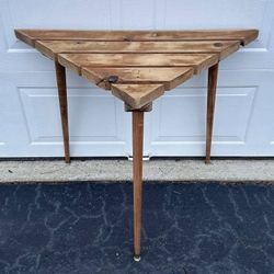 Vintage Mid Century Modern MCM Rustic Slat Wood 3 Legs Triangle Corner Console Entryway Side End Table Dry Bar$70Chapel Hill, NC