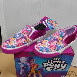 Ground Up My Little Pony slip-on toddler sneakers with a multi-character pattern and pink metallic trim. size 2$26Philadelphia, PA