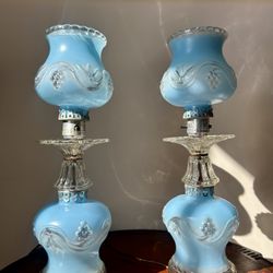 Beautiful Pair of Boudoir Table Lamps Victorian Style Blue Pressed Glass Floral Design. 💡$90Ghent, NY