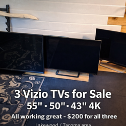3 Vizio TVs – 55", 50", 43" – All Work Great – Perfect for Garage / Gaming Setup$200Tacoma, WA