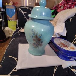 This is a ceramic ginger jar with a speckled light blue/turquoise glaze and a floral design$40Hanceville, AL