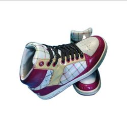 Features a bold mix of pink patent leather and red plaid textile. Stylish and eye-catching design.
