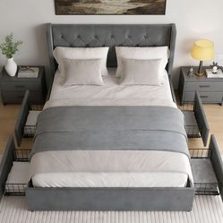 NEW Queen Bed Frame W/ 4 Storage Drawers & Wingback Headboard, Button Tufted Design - Dark Grey !$150Kennesaw, GA