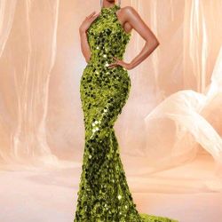 Backless Fluorescent Green Sleeveless Sequined Maxi Evening Gown, Party Dress, Wedding Guest Dress, Formal Dress, Evening Dress$70New Market, AL