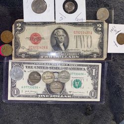 Two individual vintage bank notes 12 dollar red seal and one specialty serial number with star note some more nickels 1953 penny and some foreign coin$55Toney, AL