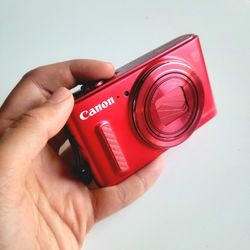 This is a red Nikon D3100 or D3200 DSLR camera with an AF-S DX NIKKOR 18-55mm lens.
