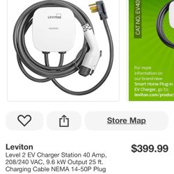 Leviton Level 2 EV Charger Station 40 Amp, 208/240 VAC, 9.6 KW Output 25 ft. Charging Cable NEMA 14-50P Plug EV40P$300Mesa, AZ