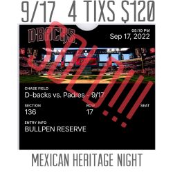 9/17 Arizona Diamondbacks Vs San Diego Mexican Heritage Night $120Phoenix, AZ