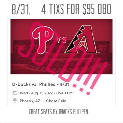 Arizona Diamondbacks Vs Phillies 8/31 4 Tixs For $95 OBO $95Phoenix, AZ