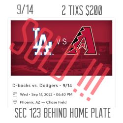 9/14 Arizona Diamondbacks Vs LA Dodgers 2 Tixs $200$200Phoenix, AZ