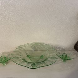 Fostoria Etched Flower Green 3-Toed Footed Bowl w/ Matching Pair Candle Holders$95Chandler, AZ