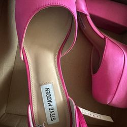 Fuchsia faux patent leather Architectural covered heel Strappy dress sandals Adjustable ankle strap with buckle closure Cushioned insole Approximate $30Tempe, AZ