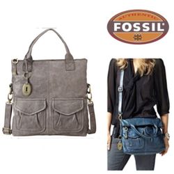 Fossil leather convertible tote/crossbody. Beyond-versatile metallic grey with front cargo pockets. Has a canvas removable crossbody strap. Fossil log$45Phoenix, AZ