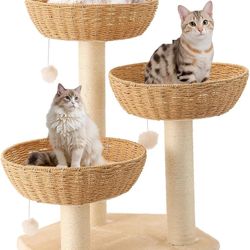 Modern Rattan Cat Tree House Condo Climbing Tower with Scratching Post for Indoor Large Adult Cat