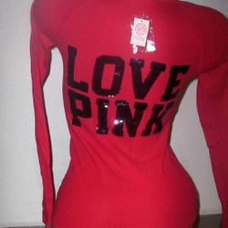 NEW W/ TAGS VICTORIA'S SECRET LOVE PINK LOGO BLACK SEQUINS BLING LONG SLEEVED T SHIRT SWEATER HENLEY TOP SMALL SM RED$40San Tan Valley, AZ