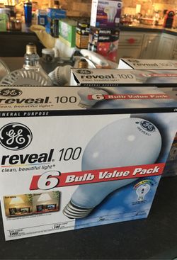 3 boxes of 6 Reveal 100 watts light bulbs A total of 16 ( one box only has 4)$9Gilbert, AZ