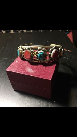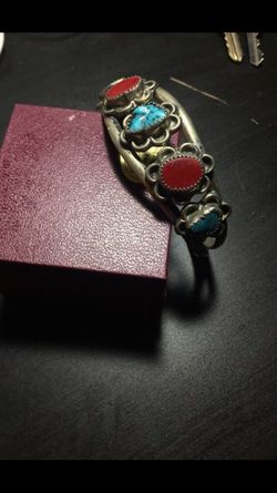 Handcrafted Native American silver bracelet cuff with turquoise and coral stones$120Mesa, AZ