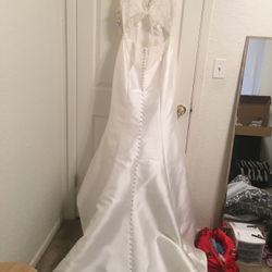 Never worn elegant white, mid length, lace and satin spaghetti strap wedding dress, size 6$100Mesa, AZ