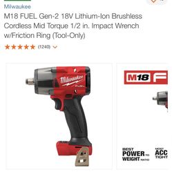 Milwaukee M18 FUEL Gen-2 18V Lithium-Ion Brushless Cordless Mid Torque 1/2 in. Impact Wrench w/Friction Ring (Tool-Only)$170Mesa, AZ