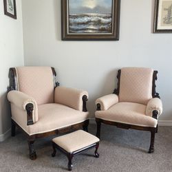 RARE! 1800’s Antique “Early Victorian” - Lion Head Armchairs (Pair) + Ottoman | Hand-Carved Solid Mahogany Wood (Set) — $2,200$2,200Phoenix, AZ