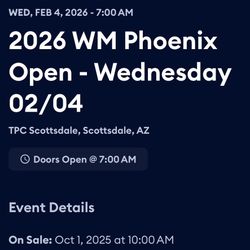 Waste Management Phoenix Open - Wednesday Only Feb 04 • Wed • 7:00AM • 2026 TPC Scottsdale, Scottsdale, Arizona, USA$80Goodyear, AZ