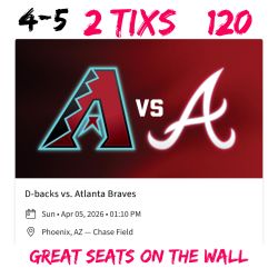 Arizona Diamondbacks vs Atlanta Braves 4/5 2 Tixs For $120$120Buckeye, AZ