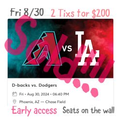 Arizona Diamondbacks Vs LA Dodgers 8/30 2 Tixs For $200 Early Access $200Buckeye, AZ