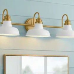 Elmcroft 29 in. 3-Light Brushed Gold Farmhouse Vanity with Designer White Metal Shades