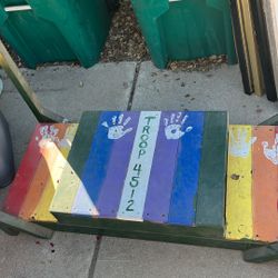 Beautiful Rustic wooden solid stand /Home Decor has a pretty cherry stain on the top and has been burned on the legs sturdy must pick up Broadway and $65Buckeye, AZ