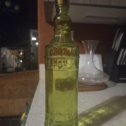 decorative green glass bottle with a raised, ornate pattern and a cork stopper. $8Mesa, AZ