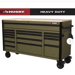 Husky Heavy Duty 61 in. W x 23 in. D 15-Drawer Matte Army Green Mobile Workbench Cabinet with Solid Wood Top$699Glendale, AZ