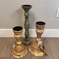 BRAND NEW- Vintage Style DownEast Ornate Wood Carved Gold/Green Candlestick Set - 20”, 15” 13” Pillar Candles$80Gilbert, AZ