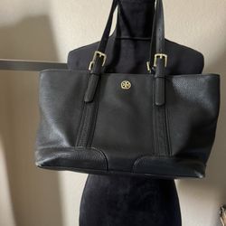 TORY BURCH Black leather tote bag with gold hardware #luxury #leather Bottom corners has some peels as shown in the pictures but other than that is $85Phoenix, AZ