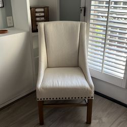 Cream color, upholstered chair with brass grommets around the bottom edge, front and sides of the chair. Fabric is linen like and crisp. Wood legs. Id$35Phoenix, AZ
