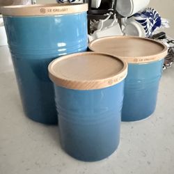 Le Creuset Marseille Blue Canister Set Wood Lid Stoneware Kitchen Set 3$129Gilbert, AZ