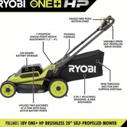 RYOBI ONE+ HP 18V Brushless 20 in. Cordless Battery Walk Behind Self-Propelled Lawn Mower w/ (2) 4.0 Ah Batteries and Chargers$280Tempe, AZ