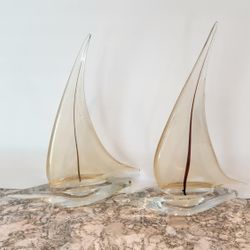 Pair Of Murano Glass Golden Sailboats, 15" Tall