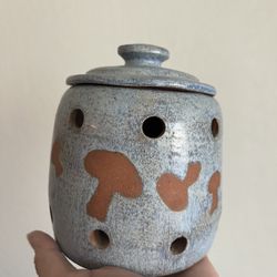 Handmade Clay Art Pottery Garlic Keeper w/Lid Blue Glaze Over Tan 6in$40Buckeye, AZ