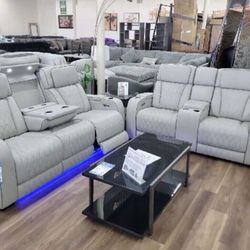 New Gray Genuine Leather Reclining Sofa And Love Seat Couch Set With USB Ports, Cup Holders, And LED Lights $3,199Phoenix, AZ