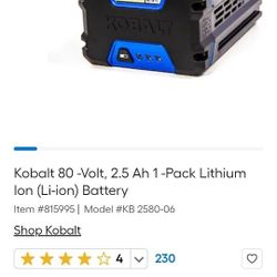 Kobalt 80 -Volt, 2.5 Ah 1 -Pack Lithium Ion (Li-ion) Battery$100Glendale, AZ