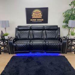 83.5” Luxury Power Reclining Sofa With LED Lights, Quilted Design & Cup Holders - Black Leather $800Tempe, AZ