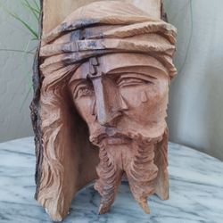 $145 Vintage Wood Cut From Log Jesus Christ With Tears, Fantastic Piece. 9" Tall 6" Wide. Home Decor